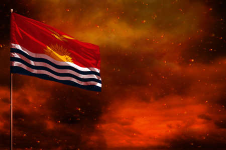 Fluttering Kiribati flag mockup with blank space for your data on crimson red sky with smoke pillars background. Kiribati problems concept.