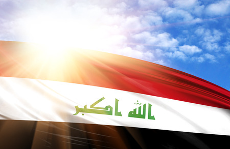 Waving Iraq Flag against blue sky with sunrays. 3d rendering