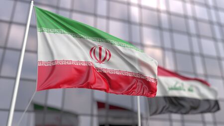 Waving flags of Iran and Iraq in front of a modern skyscraper facade. 3D rendering
