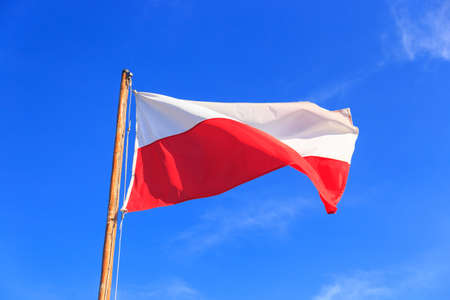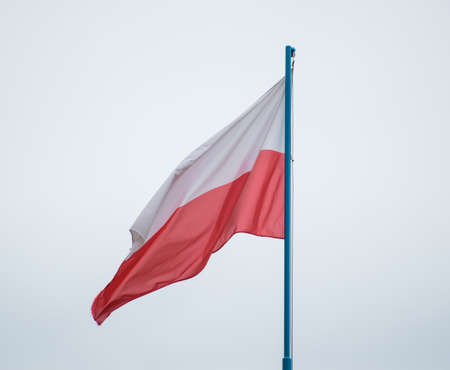 Poland, flag is fluttering in the wind photo on the background of the sky, outdoors. National flag