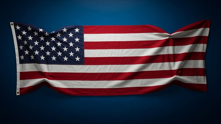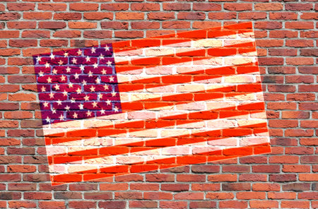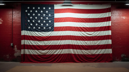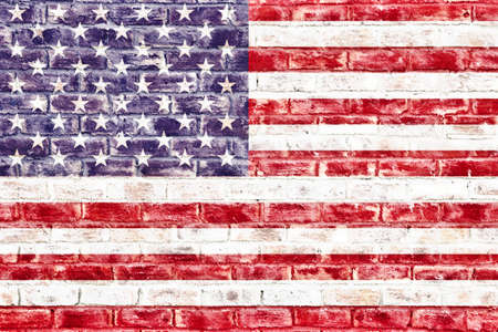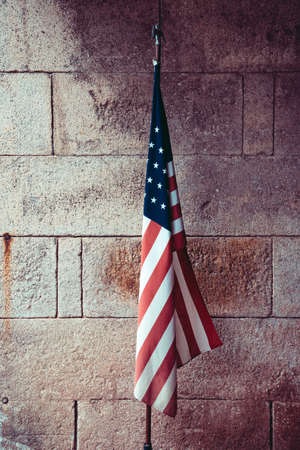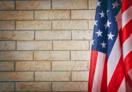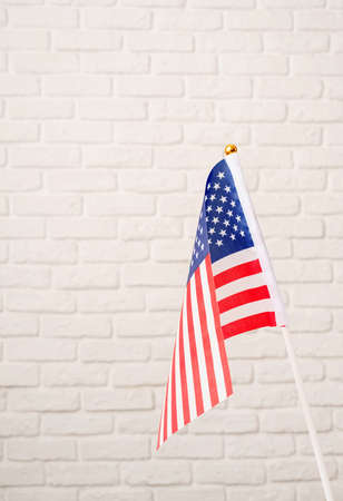 USA Memorial day, Presidents day, Veterans day, Labor day, or 4th of July celebration. USA national flag on white brick wall background with copy space