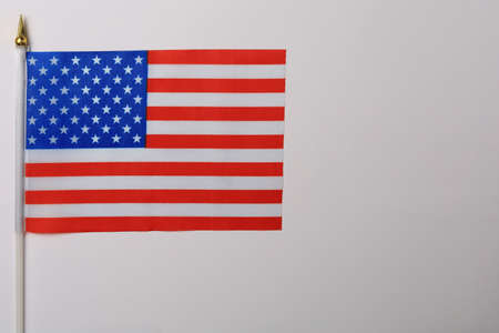 Close-up of the American flag is placed on the left side with copy space on a white brick wall background. 4th of July. Celebrate American National Day. Labor Day. Independence Day. Memorial Day