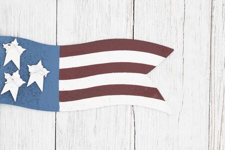American Flag for the America's 4th of July Celebration over a white wooden rustic background to mark America's Independence Day. Image shot from top view.