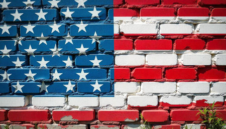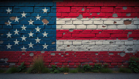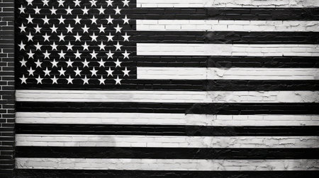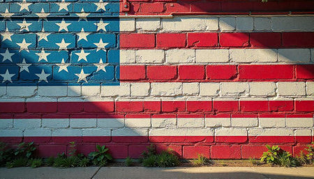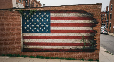 American flag mural painted on brick wall with vines. Independence Day and patriotism concept. Street art decoration for 4th of July.