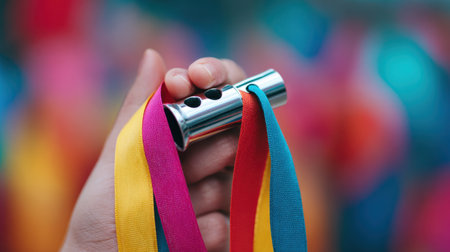 A hand grasps a metallic whistle adorned with vibrant ribbons, symbolizing celebration and excitement during lively outdoor events and festivities.