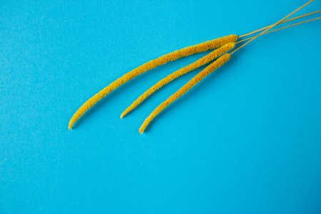 Diagonal oriented pampas leaf branch on light sky blue background. Flat lay minimal nature concept.
