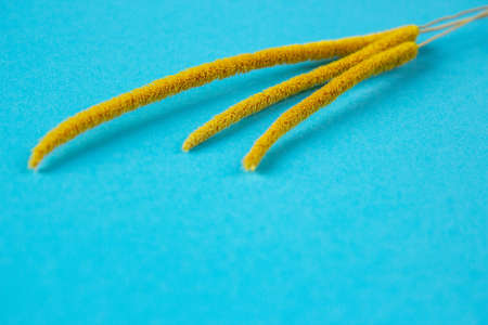 Three Menstrual tampons on a blue background. Menstruation cycle. Hygiene and protection. Disposable tampon. PMS.