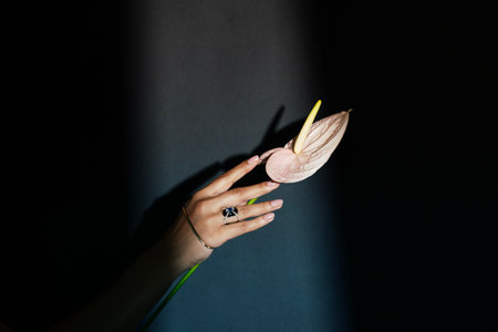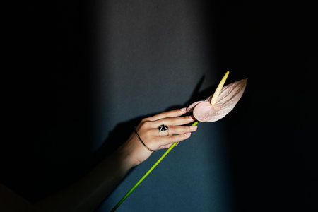 Red anthurium flower, bud copy space for text. Buying houseplants and flowers for home gardening.