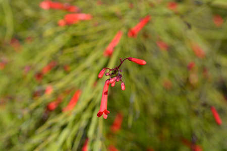 Bitter wood, Coral plant or Firecracker plant or Fountain plant or PLANTAGINACEAE or Russelia equisetiformis or red flower in the garden