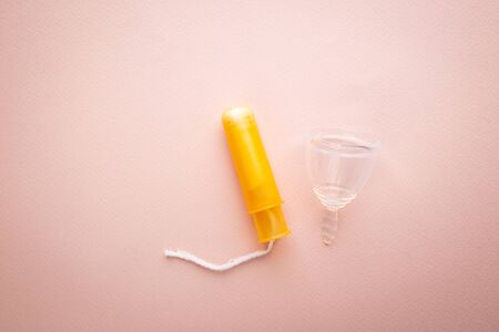 Hygiene items for womens critical days, such as menstrual cup and a tampon. Alternative healthy option for womens health. Top view, flat lay, concept of womens health issues