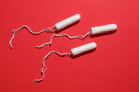 Tampons for feminine intimate hygiene on red background. Menstruation, critical days, female cycle