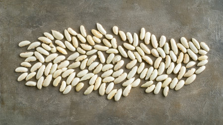This image captures a beautiful arrangement of raw unsalted white pine nuts scattered on a textured gray surface, perfect for showcasing healthy eating.