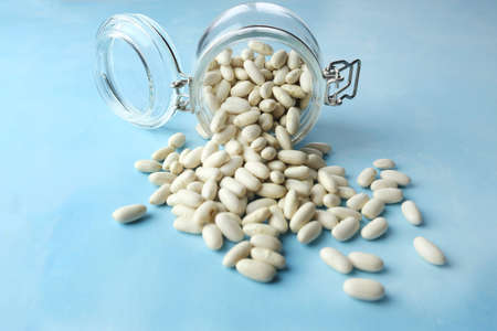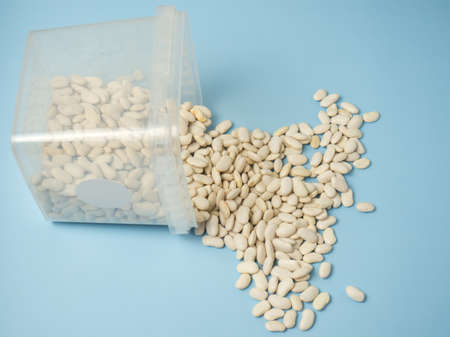 White kidney beans scattered on a blue table from a glass jar. Place for text.