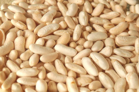 Shelled ripe seeds of kidney bean on heap. Pile of dry raw seeds of haricot (Phaseolus vulgaris) as natural background. Macro close-up. Organic farming, healthy food, BIO viands, back to nature.