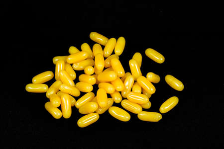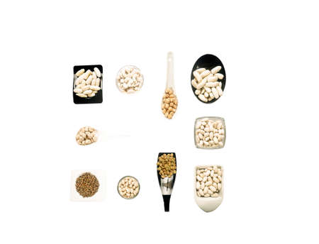 Selective focus of red kidney shape sugar coated tablet pills on white background with copy space