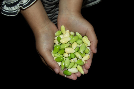 A small handful of bean seeds, a natural source of plant protein, held in the both hands. These seeds are a healthy plant based food serves as a cooking ingredient