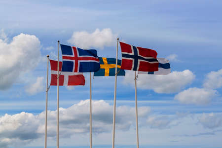 Scandinavian flags are waving in wind with clouds in the background