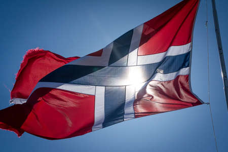 A low angle shot of the flag of Norway waving in the wind under a bright sky