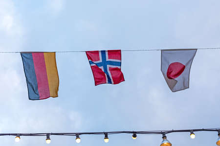 set of Flags of EU, Germany, Norway, Sweden on blue sky. Concepts of politics, tourism, economy, cooperation, eurozone and other.
