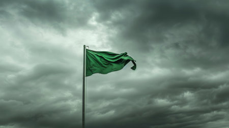 Against a backdrop of grey clouds a tattered green flag strains against its pole determined to reach new heights