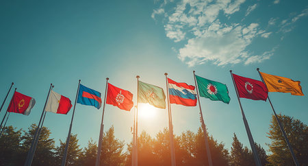 A vibrant circle of flags from various countries waves under a bright blue sky, illuminated by the sun. The colorful display captures the essence of global unity and diversity.