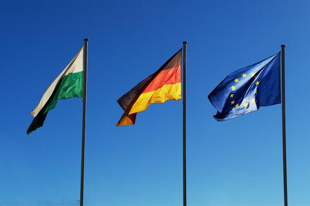 Flags of EU, germany and saxony flapping in the wind