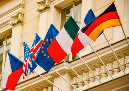 International Flags of USA, France, Italy, Germany, United Kingdom, European Union, Czech Republic and Others in a Row Symbol of Global Diplomacy, Multinational Unity and Worldwide