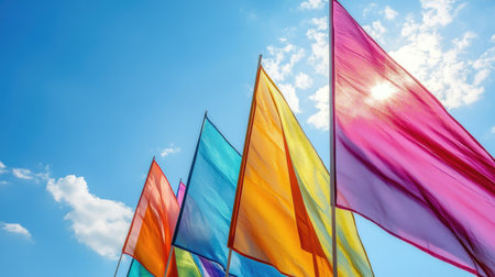 Triangular flags in a spectrum of vivid colours waving gently above a sunny sky, symbolizing joy and festivity