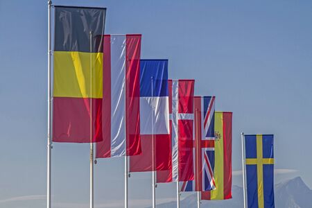 Flags of European states on flagpoles against blue sky background.