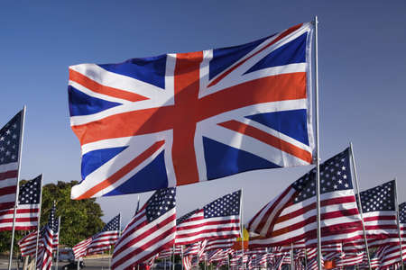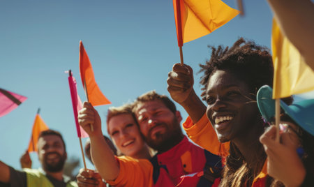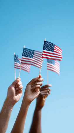 People are holding and waving small american flags against a clear blue sky, celebrating a patriotic national holiday or showing their support for the united states