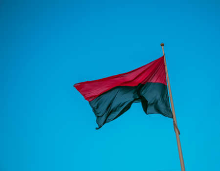 Red-black flag of Ukrainian nationalists, isolated on a blue sky background, close-up. Background of silk fabric fluttering in the air.