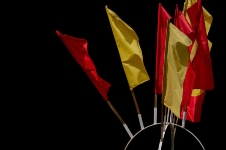 Texture of multi-colored festive red, yellow flags made of fabric. Holiday celebration satin flags of different colors in the wind. Isolate on a black background.