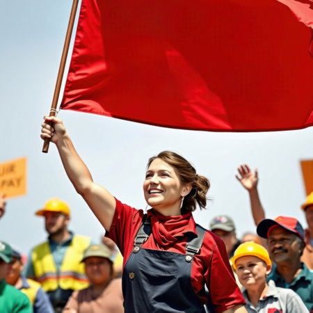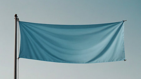 A vivid red flag waves gracefully in the wind against a bright blue sky. The sun shines brightly, creating a serene outdoor atmosphere perfect for visual storytelling.