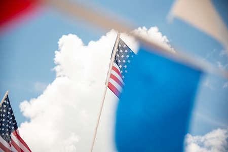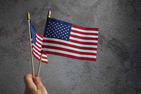 Hand holding two american flags on the blue sky with sunlight background, waving flag for United States of America close-up