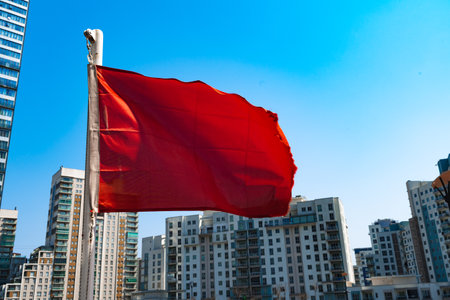 Red flag against the sky. Flag to signal the start of the competition. The symbol of the communist struggle. Red canvas on the staff. Matter vibrates in the wind.