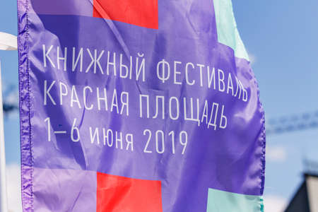 Moscow, Russia - June 02, 2019: Waving flag of Book festival Red Square 2019 in Moscow closeup against blue sky