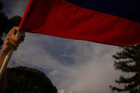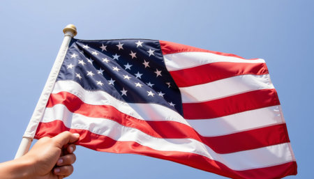 Hand gripping American flag in the breeze, symbolizing patriotism. generated by ai