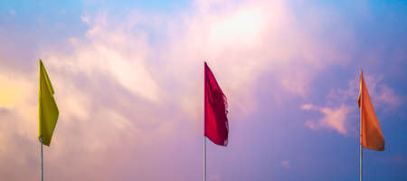 Warning or attention sign, congratulations sign three red yellow orange flag on background color of evening bright dramatic pink sunset sky cloudscape panorama. Ideal for design wallpaper