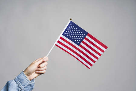 Man holding american USA flag in the sunset. Independence Day or traveling in America concept.