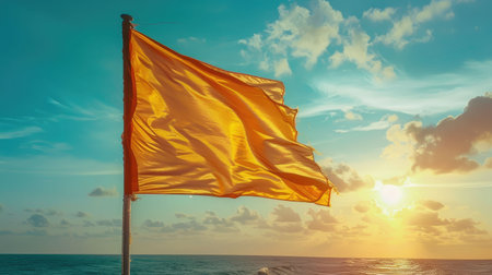 A vibrant red flag flutters under a cumulus cloud in the electric blue sky amidst the vast expanse of liquid water, signaling a warning to travelers of potential danger ahead AIG50