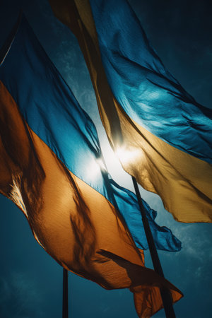 Ukrainian and Russian flags wave dynamically against a deep blue sky, backlit by strong sunlight. The low side-angle shot captures the emotive documentary mood and fabric motion.