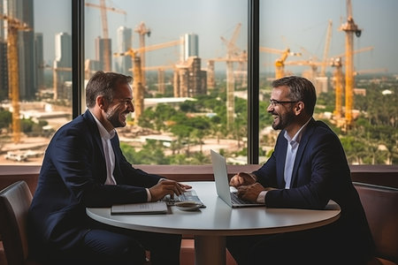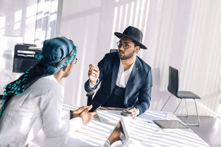 Two mixed race confident focused male experts analyzing business result sitting at table in Customer modern office in the Middle East