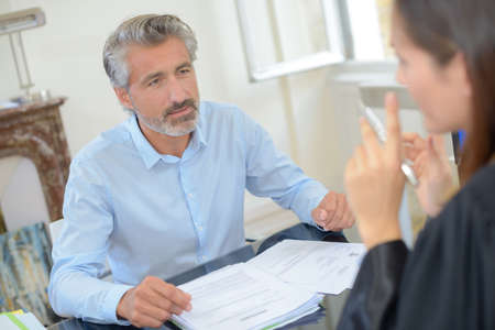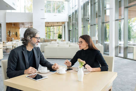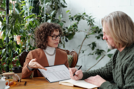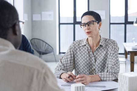 Mature business leader sitting at the table and talking to her employee during meeting at office