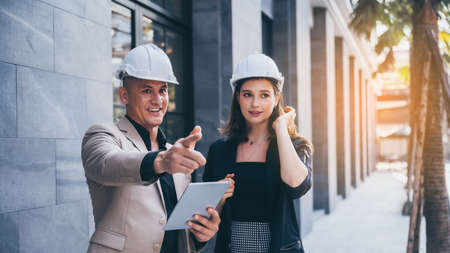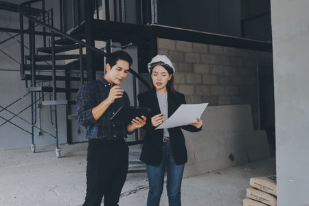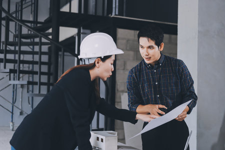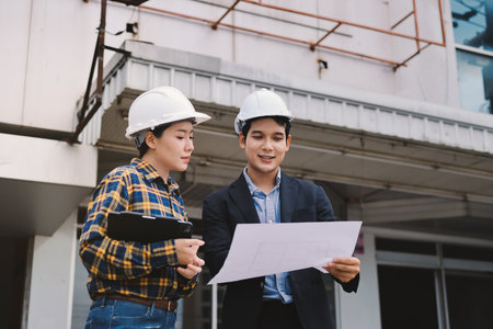 Engineers are discussing data working and blueprint with architectural project at new construction site,Engineering tools and construction concept.