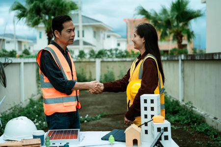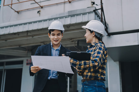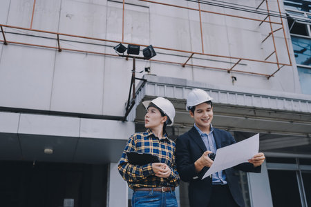 Asian engineers and architects join hands at construction sites, discussing real estate concepts, planning, and holding successful meetings.