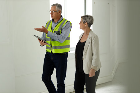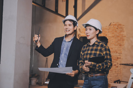 Civil engineers and architects inspecting and working building site and holding walkie talkie