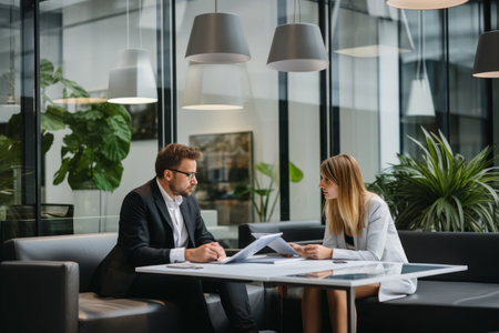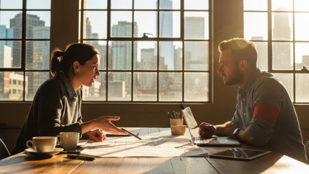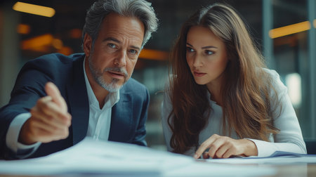 Two business professionals collaborating in a modern office setting during an important meeting.