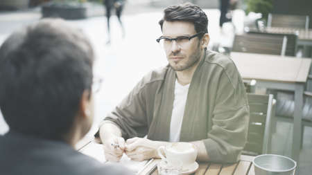 A serious man dressed in a gray jacket wearing eyeglasses listening to his friend in a cafe outdoors