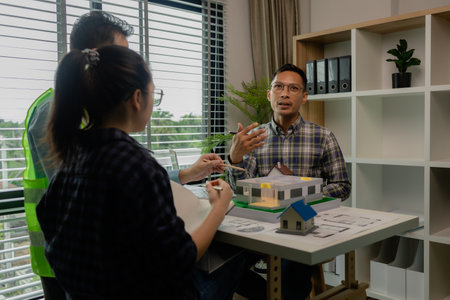 Engineers and architects analyze construction models and discuss project strategies, combining technical knowledge and creative ideas to achieve successful architectural design solutions.
