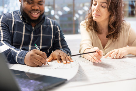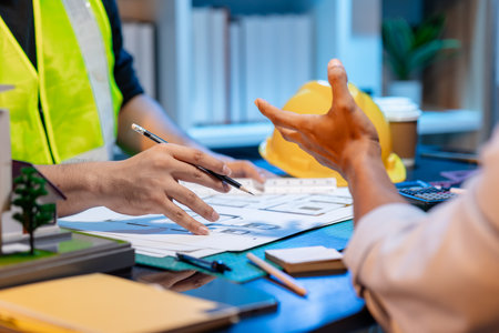 multi ethnic engineer brainstorming and measuring for cost estimating on blueprint and floor plan drawings about design architectural and engineering for houses and buildings.